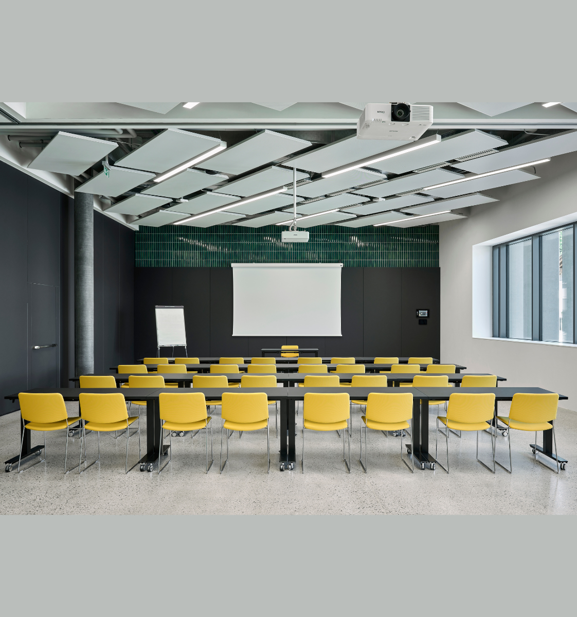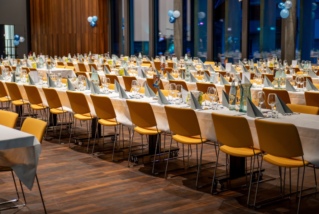 Durch ein flexibles Raumkonzept kann dieser Saal im Handumdrehen in zwei kleine Säle umgebaut werden.